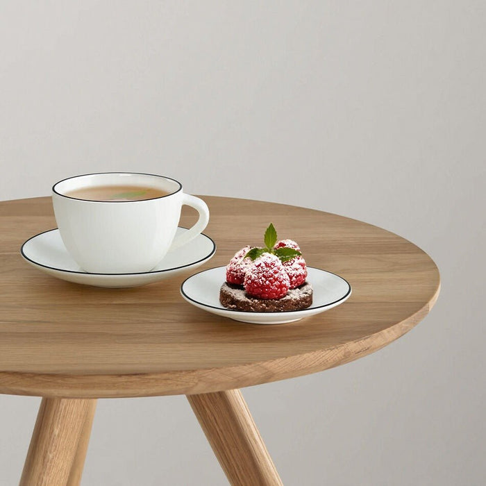 A subtle black line is used to create these distinctive Cup & Saucer set. This fine bone porcelain cup & saucer is beautiful in hand and on any table.