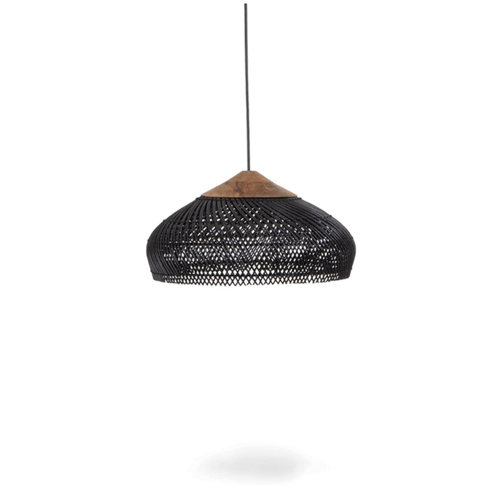 Introducing the Banjo Lamp by dBodhi in black - a natural take on classic pendant lighting. This stunning lamp features a teak top and organically shaped handwoven rattan details down the side, crafted using ancient Javanese technique.
