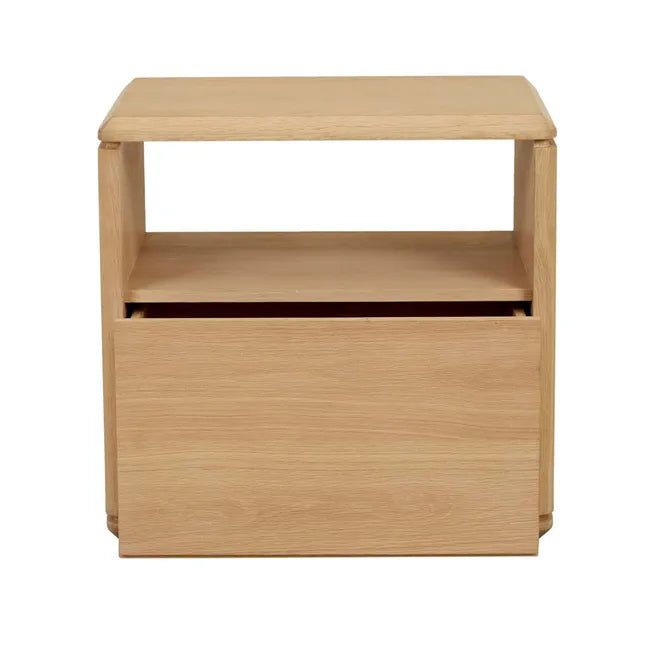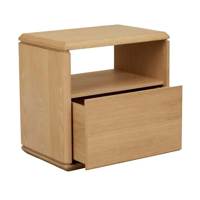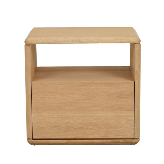 The Henry Bedside in Satin Oak captures the beauty of minimalist design with its clean lines and natural wood grain patterns. Crafted from solid oak and oak veneer, this bedside table blends durability with timeless elegance. Its spacious top surface, generously proportioned drawer, and open storage compartment provide ample functionality for modern bedrooms.