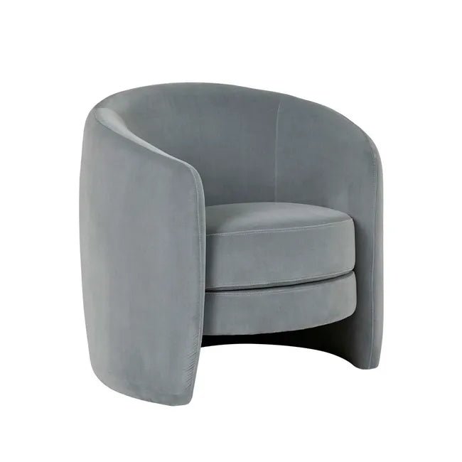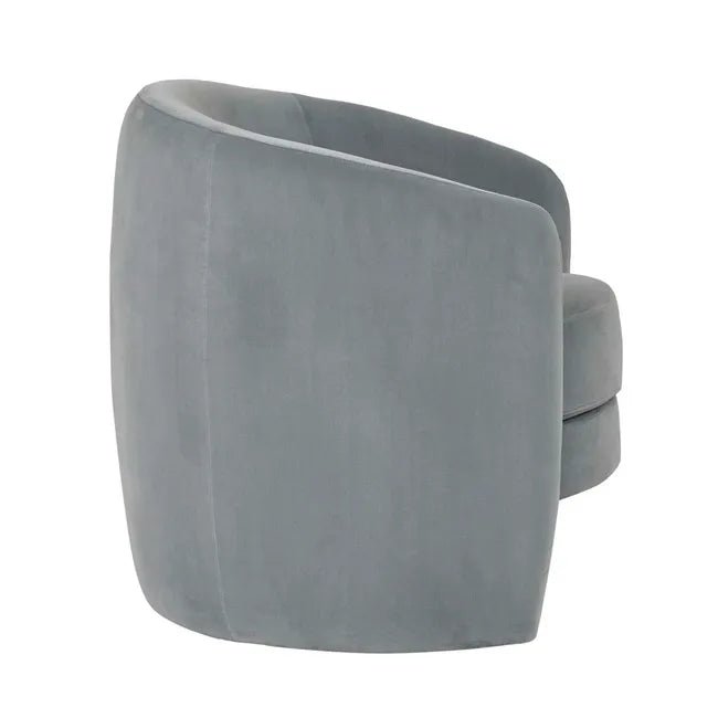 The Kennedy Tenner Occasional Chair in Misty Blue Velvet exudes timeless elegance and inviting comfort. Its barrel-shaped design and modern base create a stylish silhouette, making it a perfect addition to any living area or bedroom. Fully upholstered in luxurious velvet, this chair transforms your space with its sophisticated presence and plush texture.