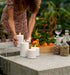 Create the ultimate outdoor ambience with our new remote enabled flameless candle. They look like real wax candles, but they won't melt in the sun, and now there is no mad dash to bring them inside every time it rains.